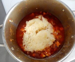 Po této době přidáme kysané zelí (zelí předtím trochu propláchněte vodou, aby nebylo tak kyselé). Guláš necháme vařit dalších 20 minut.