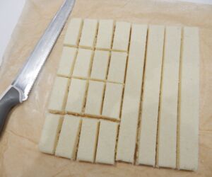 Dáme ztuhnout do lednice. Ztuhlé krájíme nožem na tyčinky nebo čtverečky. Velikost je na vás, menší se jí lépe.