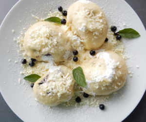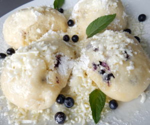 Borůvkové kynuté knedlíky posypeme tvarohem a moučkovým cukrem a přelijeme rozpuštěným máslem.