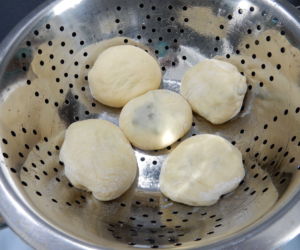 Do mísy kuchyňského robota prosejeme mouku a uděláme důlek, kam vylijeme teplé mléko, přidáme lžíci cukru a vysypeme sušené droždí. Necháme 10 minut vzejít kvásek. Poté přidáme zbytek surovin – špetku soli a vejce. Kuchyňského robota zapneme a necháme ho zpracovat vláčné hladké těsto (trvá to přibližně 15 minut). Těsto lehce zaprášíme hladkou moukou, zakryjeme utěrkou a necháme na teplém místě asi 45 minut kynout.