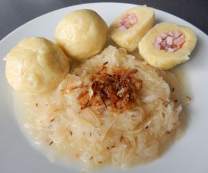 Bramborové knedlíky plněné uzeným masem jsou vždy velká pochoutka. Dobrou chuť.