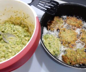 Usmažené brokolicové placky dáme na papírové ubrousky, aby se vysál přebytečný tuk.