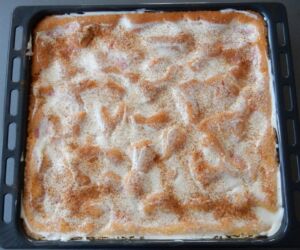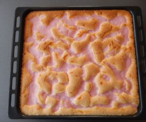 Těsto nalijeme na vymaštěný a vysypaný plech.