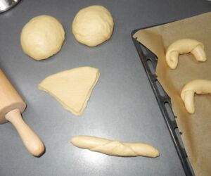 Vykynuté těsto krátce propracujeme na pracovní desce a rozdělíme na 3 stejné části. Z každé vyválíme kolo a to rozřízneme do kříže (takže máme z jednoho kola 4 „trojúhelníčky“). Každý dílek ještě trochu vyválíme, ale tak, aby si zachoval tvar, a srolujeme od dlouhé strany ke špičce. Loupáček ještě trochu poválíme po pracovní desce a ohneme do typického loupákového tvaru.