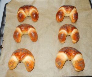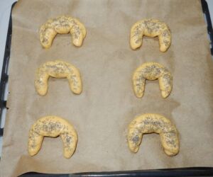 Loupáky skládáme na plech po 6 ks. Loupáky necháme na plechu ještě alespoň 20 minut nakynout a poté je potřeme rozkvedlaným vejcem a posypeme mákem.