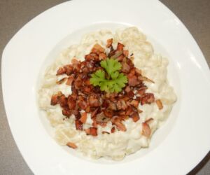Halušky s brynzou rozdělíme na talíře a posypeme osmaženou cibulkou a slaninou.