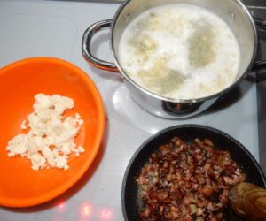Těsto na halušky necháme stát a mezitím si nakrájíme cibuli a slaninu a dáme restovat na pánev na troše sádla.