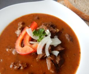 Hovězí guláš podáváme s houskovým knedlíkem či čerstvým chlebem.