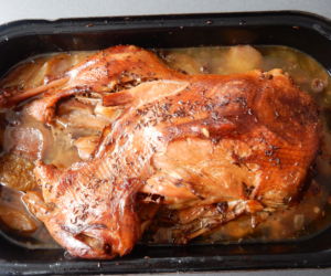 Po deseti hodinách husu otočíme prsy nahoru a zvýšíme teplotu na 125°C a dopečeme dozlatova. Od teď už husu kontrolujeme a občas polijeme výpekem. Dopékáme dozlatova 2 – 4 hodiny.