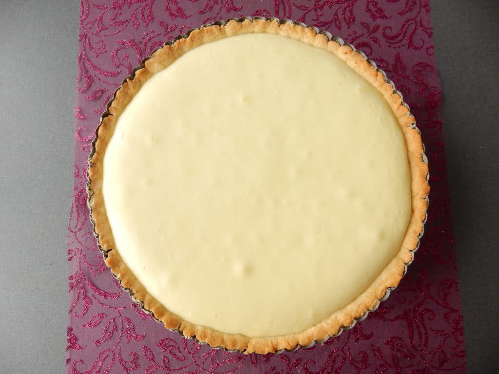 Na tvarohovou náplň smícháme tvaroh, žloutek, cukr, vanilkový cukr a promícháme. Z bílku vyšleháme tuhý sníh a lehce ho vmícháme do tvarohu. Tvarohovou náplň rovnoměrně nalijeme na korpus a vložíme asi na 40 minut do předehřáté trouby na 170°C.