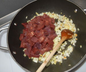 Vepřová játra důkladně opláchneme pod tekoucí vodou a osušíme. Části, kde jsou případně blanky, či cévy dáme pryč. Játra pokrájíme na malé kousky. Cibuli oloupeme, pokrájíme a necháme zezlátnout na pánvi na troše oleje. Poté přidáme játra a restujeme. Játra pouze opepříme a okmínujeme. Sůl zatím nedáváme, aby játra neztvrdla. Podlijeme asi 600 ml vody a dusíme 30 minut. Dle potřeby přidáme vodu.
