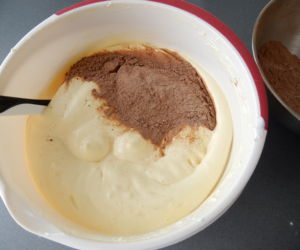 Nakonec do těsta, velice jemně, stěrkou zamícháme mouku s kakaem.