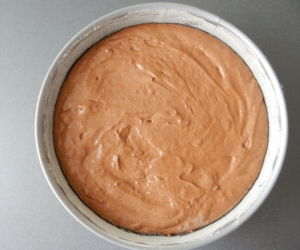 Těsto přesuneme do dortové formy, rovnoměrně rozetřeme a vložíme do předehřáté trouby na 180C°. Pečeme asi 25 – 30 minut. Špejlí zkoušíme, zda ještě není uvnitř syrový.