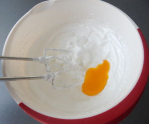 Poté ztlumíme otáčky a po jednom zašleháváme žloutky a olej.
