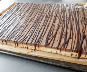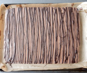 Z upečeného korpusu ‚sloupneme‘ pečící papír a na spodní stranu natřeme rovnoměrně krém. Nakonec kokosové řezy pocákáme čokoládovou polevou.