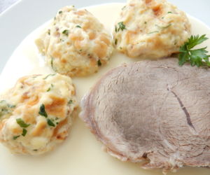 Křenovou omáčku podáváme s karlovarskými koulemi a krájeným vařeným masem.