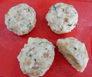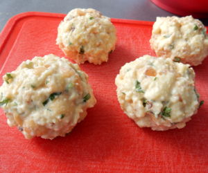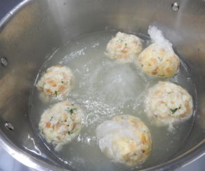 Směs na karlovarské koule rozdělíme na deset dílků, z každého uděláme kouli a vaříme v mírně osolené vodě asi 18 minut. Jednotlivé koule můžeme zabalit do potravinové folie, ale více nám chutnají jen tak z vody.