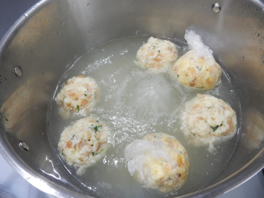 Směs na karlovarské koule rozdělíme na deset dílků, z každého uděláme kouli a vaříme v mírně osolené vodě asi 18 minut. Jednotlivé koule můžeme zabalit do potravinové folie, ale více nám chutnají jen tak z vody.