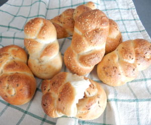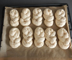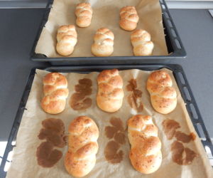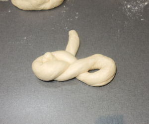 Po hodině kynuté těsto rozdělíme na 10 stejných dílu. Z každého dílu vyválíme „hada“, kterého spleteme do housky. Pravý konec napojíme do poloviny, levý konec podvlečeme, vzniklé oko otočíme a konec, který jsme podvlékali, zamáčkneme do otočeného oka (viz fotogalerie).