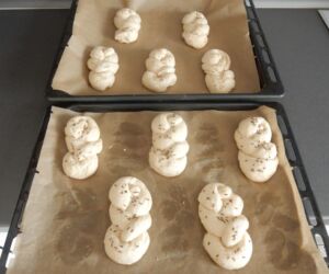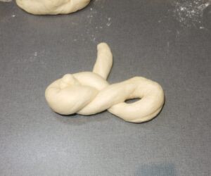 Po hodině kynuté těsto rozdělíme na 10 stejných dílu. Z každého dílu vyválíme „hada“, kterého spleteme do housky. Pravý konec napojíme do poloviny, levý konec podvlečeme, vzniklé oko otočíme a konec, který jsme podvlékali, zamáčkneme do otočeného oka (viz fotogalerie).