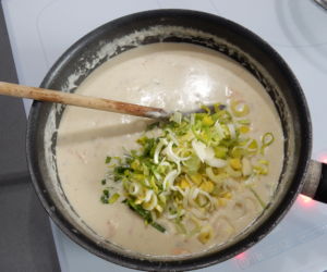 Následně přidáme pokrájenou nivu a rozetřený česnek. Mícháme, dokud se niva nerozpustí. Úplně nakonec přidáme pórek a případně dochutíme solí a pepřem.