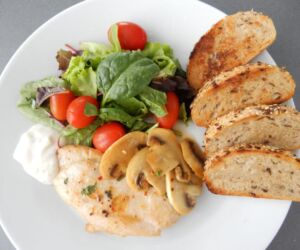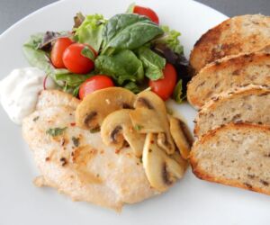 Rychlý recept na vynikající kuřecí prso s žampiony, čerstvým salátkem, opečenou bagetkou a jogurtovým dipem. Rychlé, snadné a lehké jídlo, na kterém si pochutnáte.