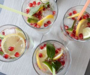 Do 5 litrové nádoby (nebo více menších) dáme led, kousky citronu a limetky, granátová zrníčky, mátu a zalijeme perlivou minerálkou.