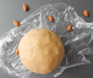 Na těsto smícháme dětskou krupičku, moučkový cukr, máslo, vodu, mandlovou tresť, salko, mleté piškoty a rum. Vypracujeme těsto, které necháme v lednici do druhého dne, aby se krupička nasákla.