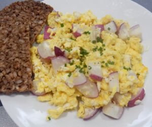 Míchaná vajíčka s ředkvičkami jsou rychlá a chutná večeře, snídaně či svačina. Nebojte se přidat na pánev pár ředkvičkových listů a obohatit si tak jídlo a dalších pár vitamínů.