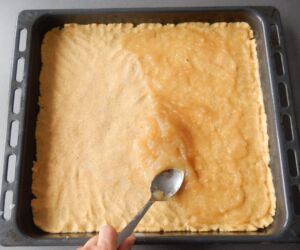 Asi 1/3 těsta dáme bokem. Zbytek těsta vyválíme, přeneseme na vymaštěný plech a ručně doopravíme (nebo jej můžeme ručně roztáhnout přímo na plechu).