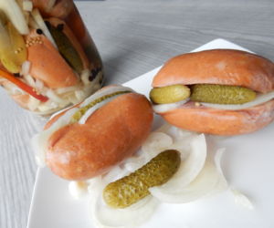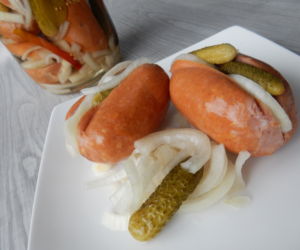 Cibuli oloupeme, přepůlíme a nakrájíme na půlměsíčky. Špekáčky oloupeme, podélně prokrojíme, ale úplně nedokrojíme. Dovnitř špekáčku nacpeme cibuli a malé okurečky, můžeme zafixovat párátkem.