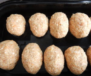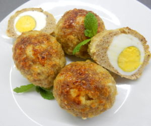 Uvařená oloupaná vejce zabalíme do mletého masa, naskládáme do pekáčku, podlijeme trochou vody a pečeme na 180°C asi 45 minut.