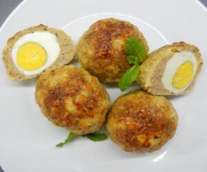 Uvařená oloupaná vejce zabalíme do mletého masa, naskládáme do pekáčku, podlijeme trochou vody a pečeme na 180°C asi 45 minut.