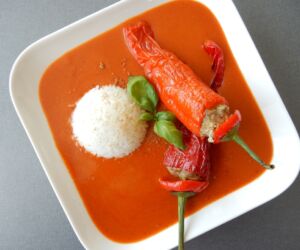 Papriky očistíme, vydlabeme a naplníme směsí. Podlijeme trochou vody a pečeme v předehřáté troubě na 170°C asi 65 minut.