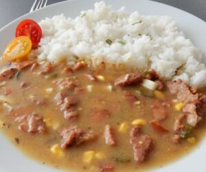 Pokud se šťáva hodně vyvařila, přidáme vodu. Omáčku zahustíme hladkou moukou, kterou jsme rozmíchali ve studené vodě a za občasného promíchání 10 minut provaříme. Dle chuti dosolíme a opepříme. Úplně nakonec do omáčky promáčkneme uvařená vejce. Podáváme s rýží.