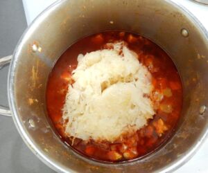 Po této době přidáme kysané zelí (zelí předtím trochu propláchněte vodou, aby nebylo tak kyselé). Guláš necháme vařit dalších 20 minut.