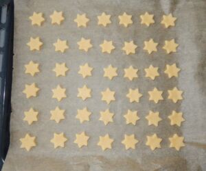 V míse smícháme všechny suroviny – mouku, máslo, smetanu a žloutek. Vypravujeme hladké těsto, které necháme hodinu odpočinout v lednici.