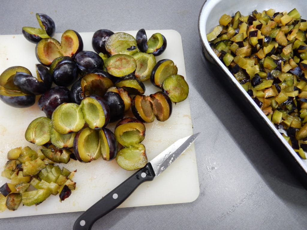 Švestky omyjeme, vypeckujeme a nakrájíme na malé kousky.