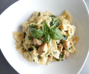 Těstoviny s kuřecím masem, špenátem a smetanou jsou velice rychlé, snadné a chutné jídlo.