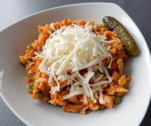 Vepřové rizoto na talíři posypeme strouhaným sýrem.