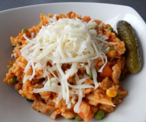 Cibuli a česnek nakrájíme nadrobno, zpěníme na sádle, přidáme na malé kousky nakrájené maso, osolíme, opepříme, asi 5 minut restujeme, přidáme rýži, zamícháme a podlijeme vodou. Přidáme nakrájenou mrkev a petržel, sterilovanou okurku, sůl, pepř, mletou papriku a kmín. Dle potřeby podléváme vodou, dokud není rýže měkká (asi 20 minut). Nakonec přidáme hrášek a kukuřici, 2 minuty provaříme a případně dosolíme.