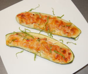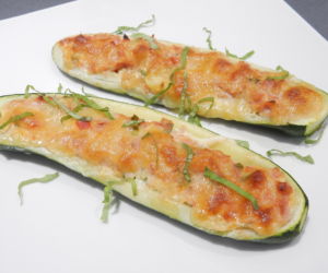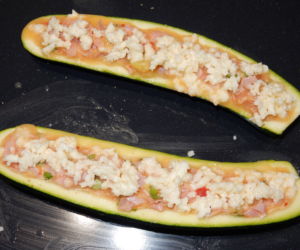 Z cukety vylijeme vodu a lehce opepříme. Vydlabané cukety naplníme směsí a posypeme zbytkem mozarelly.